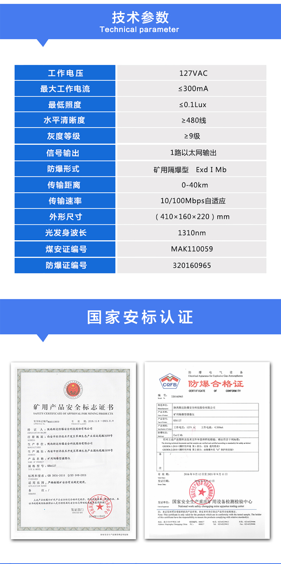 產(chǎn)品描述:MA煤安認證防爆認證,清晰度高,性能穩(wěn)定。CMOS傳感器。光纖傳輸、帶寬大、速度快,AE控制,信噪比高。防潮防腐蝕。
