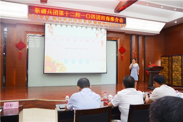 (▲一〇四團經(jīng)濟發(fā)展辦公室羅紅梅女士作招商引資項目簡介)