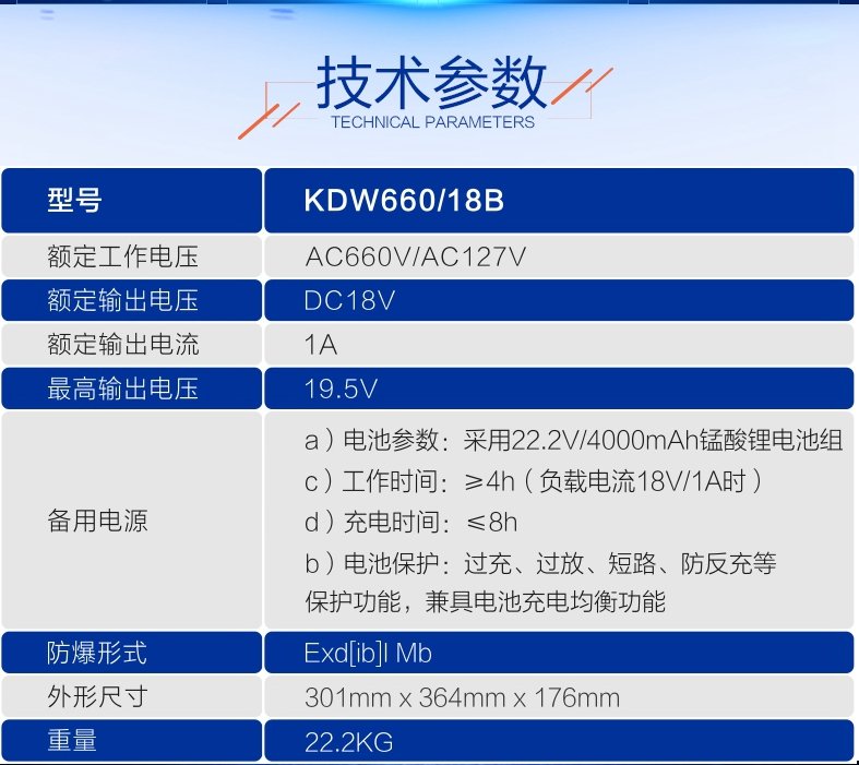 ? ? ? ?斯達(dá)防爆KDW127/18B隔爆兼本安型直流專為煤礦井下隔爆型和本安型用電設(shè)備提供DC18V電源,支持兩種電壓輸入,安裝形式多樣,方便移動(dòng),同時(shí)兼具大功率輸出、電壓穩(wěn)定、紋波小的特點(diǎn)。額定工作狀態(tài)內(nèi)置電池可持續(xù)供電4小時(shí)以上,滿足井下本安設(shè)備的供電要求。具備過載、過壓、過流保護(hù)功能。故障狀態(tài)恢復(fù)后,自動(dòng)恢復(fù)工作。